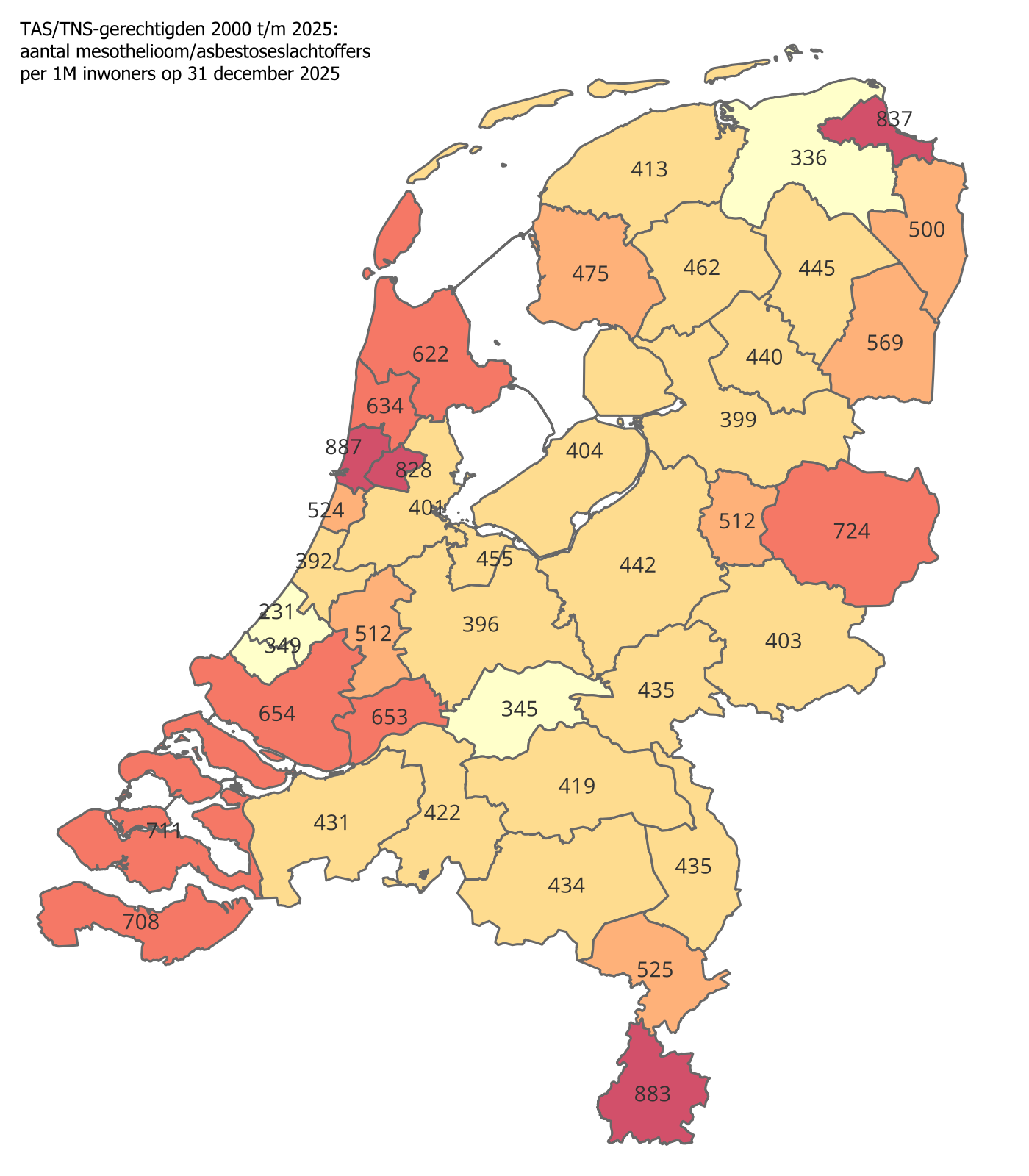 Op de kaart hieronder is te zien dat aanvragers van een tegemoetkoming via de Regeling TAS en TNS vooral in gebieden wonen waar in het verleden met asbest is gewerkt: op scheepswerven, in asbestproductie, isolatie- en asbestverwerkende bedrijven en in de metaal- en elektrotechnische industrie. Het gaat met name om de havens in Zeeland, Rijnmond en Noord-Oost Groningen, de industrie in Noord- en Zuid-Holland, de Marine in Den Helder, de mijnbouw en chemie in Zuid Limburg en de asbestverwerkende industrie in Twente rond Enschede (textiel) en Goor (Eternit fabriek). De plattegrond laat het aantal TAS/TNS-gerechtigden zien per miljoen inwoners over de periode 2000 t/m 2025.